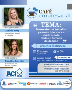 Café Empresarial: Bem-estar no trabalho – pessoas, liderança e saúde mental Publicado em 15 de maio de 202515 de maio de 2025 por ACI Santa Cruz do Sul